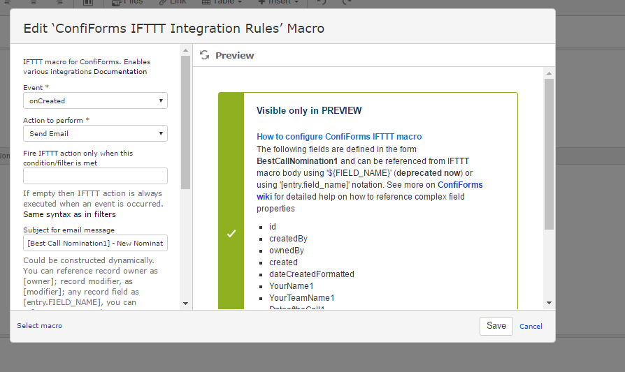 The template for the IFTTT macro is what you put in the body of the macro. I use ConfiForms all the time at my organization, so if you provide that I could probably help track down the issue ... assuming what is in the body is not confidential. If it s don't post t. :)