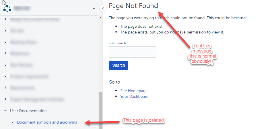 I want to understand more how you are replicating it. Is the User Documentation page the one you're importing as a Word document, so you're wanting it to delete the child page of that, which is the Document Symbols page? If you were to delete a page normally, does the issue also occur?