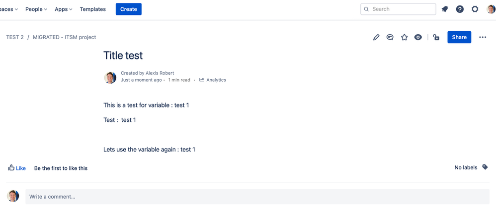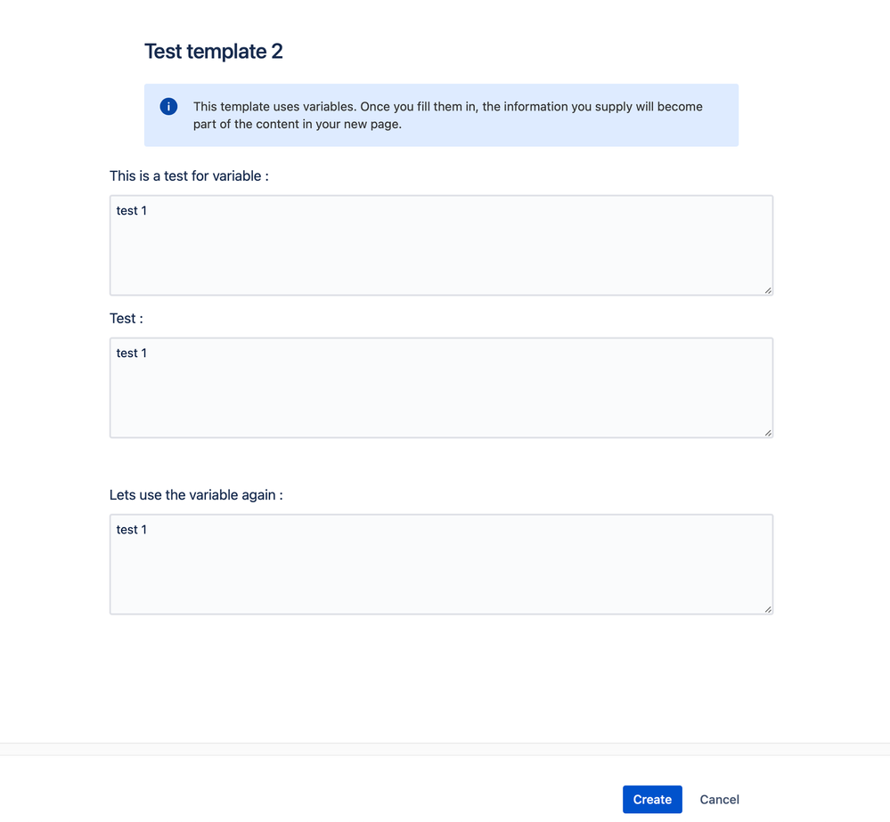 Here's what it looks like on my Confluence, when creating the template, using it to create a page, and publishing it :