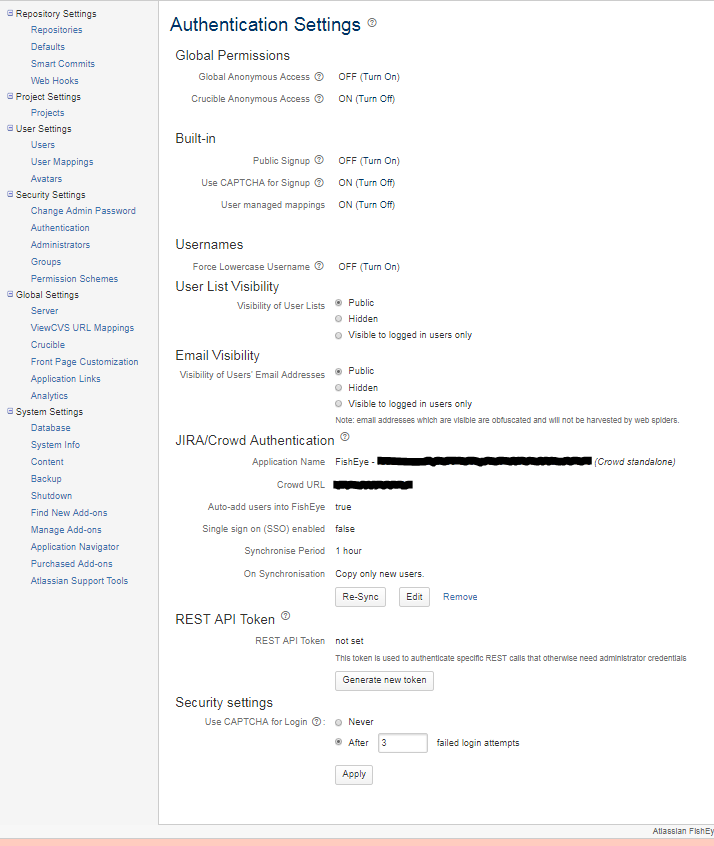 I am administrating a Fisheye + Crucible server version:3.7.0 Build:20150127093303 2015-01-27. I want to switch from Crowd to LDAP for authentication. According to this this page I should have an option "Set up LDAP" under Security Settings / Authentication. The problem is I don't. Any ideas where or how I can authenticate with my AD server?