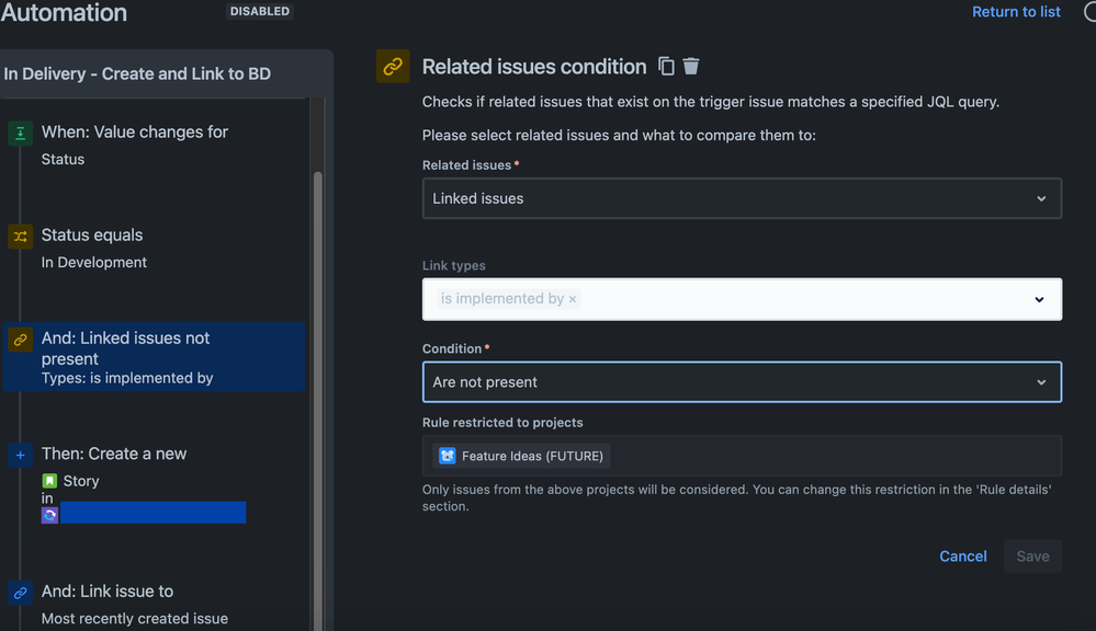 You are correct @Curt Holley Thank you SO Much! The odd thing that is hard to get my mind around is that with the automation I was able to generate a new issue in a new project, so I didn't think just checking for 'is implemented by' was restricted to the project type, and instead thought that scope restriction was limited to "edits" of other issues. Don't love the incongruity there but so glad you were able to push me in the right direction.