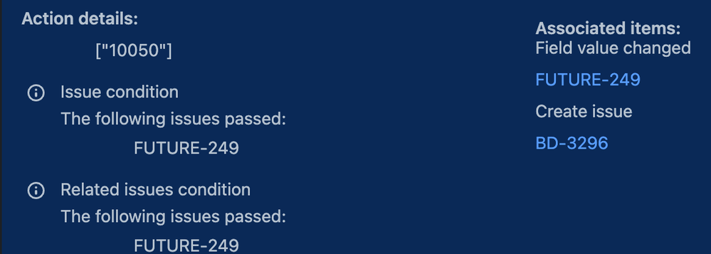 As a note here is the automation audit log reporting Pass on the Related Issue criteria when a delivery ticket (implemented by) is attached:
