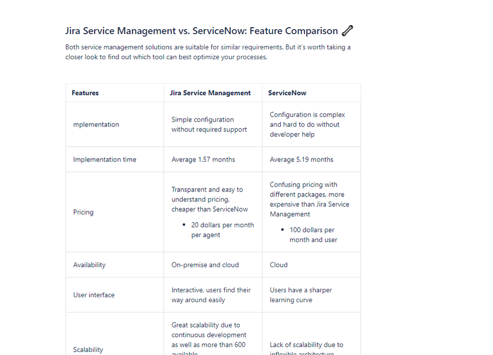 Jira Service Management is comparatively more user-friendly and integrates ideally with other Atlassian products, enabling seamless collaboration and breaking down silos in organizations. In contrast to other ITSM platforms, JSM users save 80% on costs and benefit from a transparent pricing model with no hidden fees or expiring discounts. The uncomplicated adaptation to (growing) business requirements is also one of the advantages of Jira Service Management.