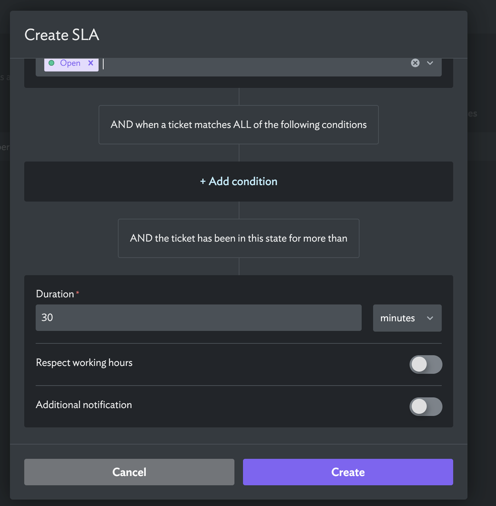 Creating an SLA now happens at the Queue level, and uses this new modal. You can select statuses, conditions, duration, and whether they respect working hours from here. You can also enable an additional notification for before an SLA is going to breach.