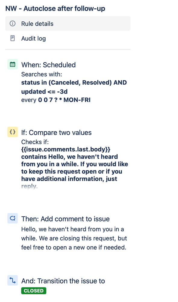 I have an auto close rule that closes tickets after 5 days of waiting for the customer to reply, however they seem to get grumpy with the auto close so I tried to add automation to warn them 24 hours before closure.