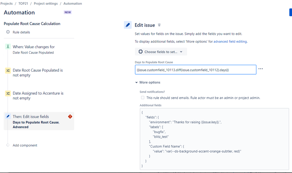 I am attempting to calculate the difference between two custom fields (in days) and populate the result into a number field.