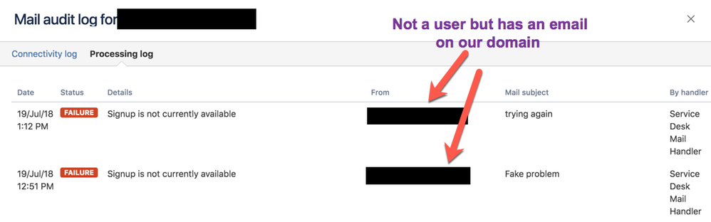 I have one employee who is not a user trying to submit a ticket and it is getting tied up with the email handler with the error "Signup is not currently available". I have attached my permissions screen and the error handler. Can someone help me out of this hole I am in?