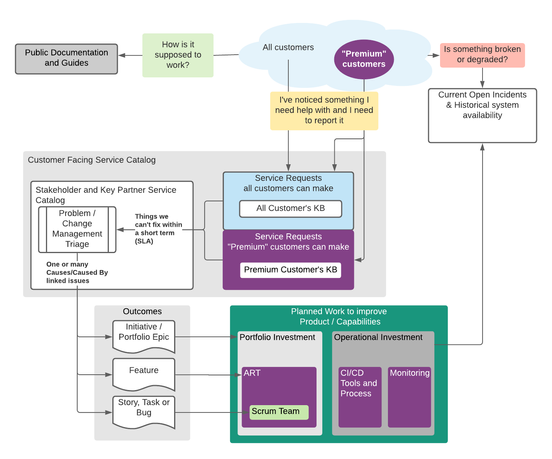 This is my common top level view that orients all these ideas in terms of process, team hand offs and ultimately tools. I include it because your question seems to imply this is all entirely within Jira Service Desk. Jira Service Desk is the part customers use to interact with us directly, but there are other parts, and other tools, in play.