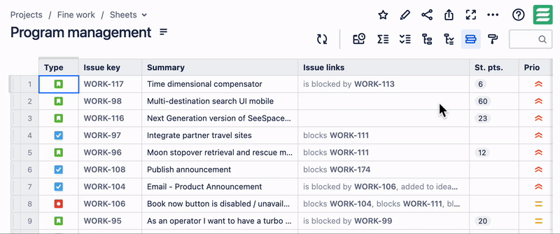 JXL is a full-fledged spreadsheet/table view for your issues that allows viewing, inline-editing, sorting, and filtering by all your issue fields - including your issues' issue links - much like you’d do in e.g. Excel or Google Sheets. It also allows bulk editing and bulk cleaning your fields, like so: