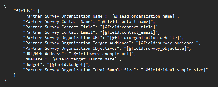 Your JSON carries a payload in this order: Fields > Partner Survey Organization Name