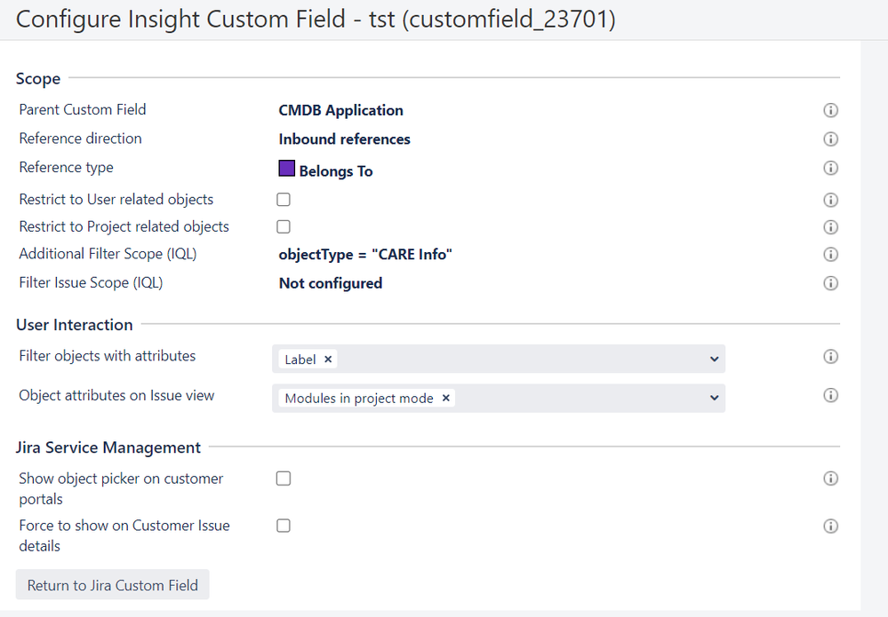 On the issue view all linked applications are presented (so when customer A creates a ticket, we show the linked applications, Insight objects 'Customer Application X' and 'Customer Application Y')