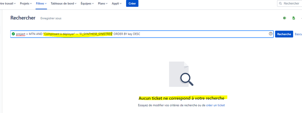 Then I need to process a JQL query filtered on this custom field (in my example below, all tasks containing the value "FI_SYNTHESE_SINISTRES" in this custom field) but with the full searched value the results list is empty :