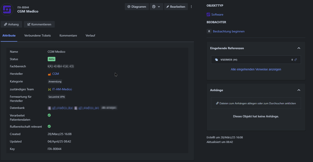 {Name=CGM Medico, Status=30, Fachbereich=KAS-KHBA-KLK: KIS, Hersteller=80945, Kategorie=Anwendung, zuständiges Team=56885}