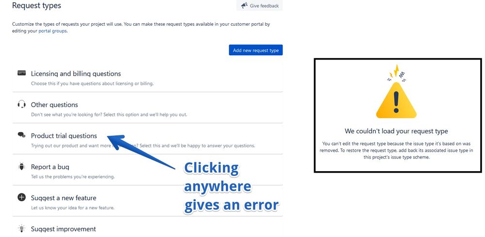 Now if change the issue type scheme, I'm unable to access the Request types forms and get an error.