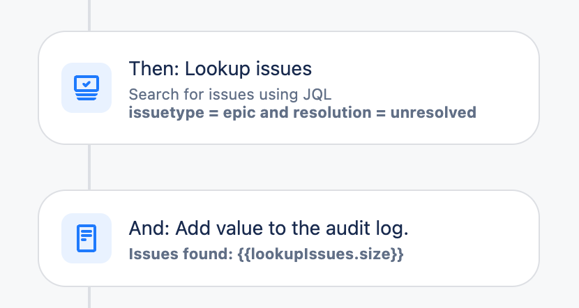 Of course, replace the JQL in the Lookup issues action with the query that you need for your use case. Also note that Lookup issues will return a maximum of 100 issues.