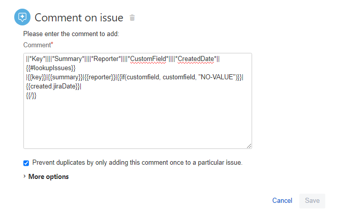 So in the next section of the automation is where we need some help. We want the results of the lookup to be given in a comment for the issue assignee to review, but we need more than just the issue key and we want a little bit of logic behind it.