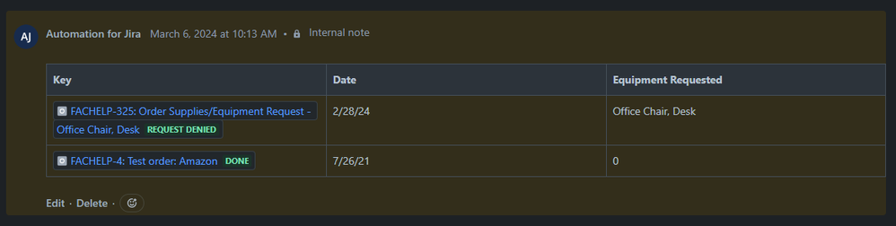 We have a form for when employees want to request equipment/furniture. When this request comes in, we are wanting a comment placed on the issue letting the assignee know if the employee has made a similar request before.