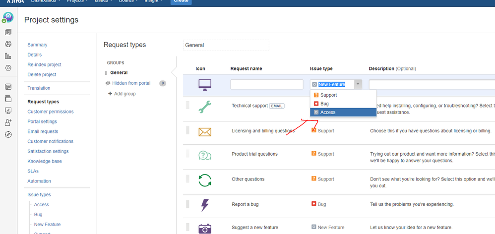 that request is to be set up (according to the tutorial) as an issue type of "Access" - we definitely need this issue type in our organization. However, there are only three issue types for me to pick from and it does not seem that there is an opportunity to add any new issue types, including many of the ones shown in previews or demos.