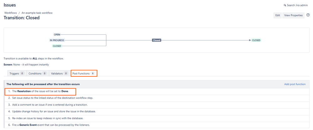 2. Add a post function to automatically set the "Resolution" field to a value like "Done".