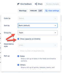 Lastly, under View settings, make sure you are grouped by Team, with Show capacity on timeline checked: