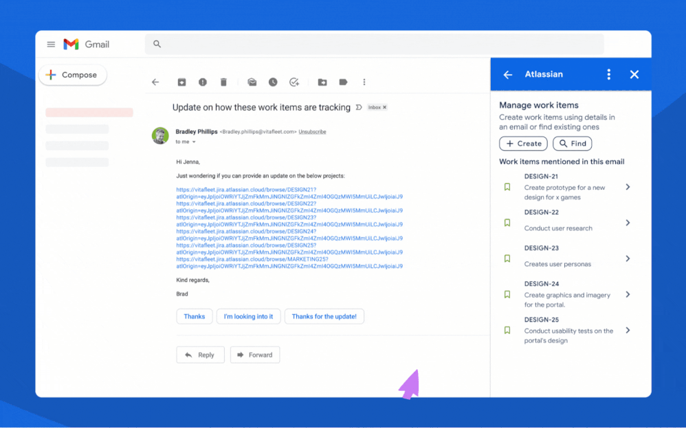 Gmail seamlessly integrates with Jira so you can turn emails into work items, view, edit, comment on, and track updates to keep work moving forward - right from your inbox.