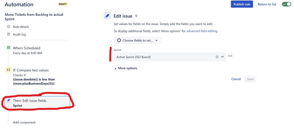 We create once per year all Tickets. And 5 Days before the due date, the Tickets should move from Backlog to the active Sprint. At the moment, we move the Tickets manually. Therefore we want to create a automation.
