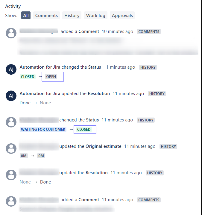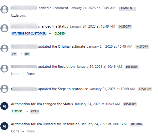 We have an issue that Automation for Jira opens closed tickets automatically, so customer cannot close tickets themselves through portal.