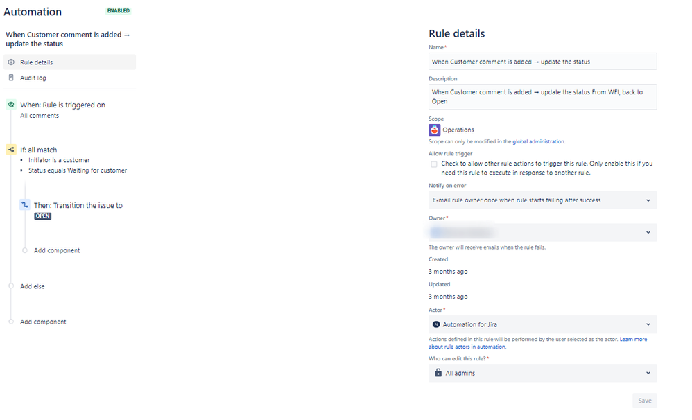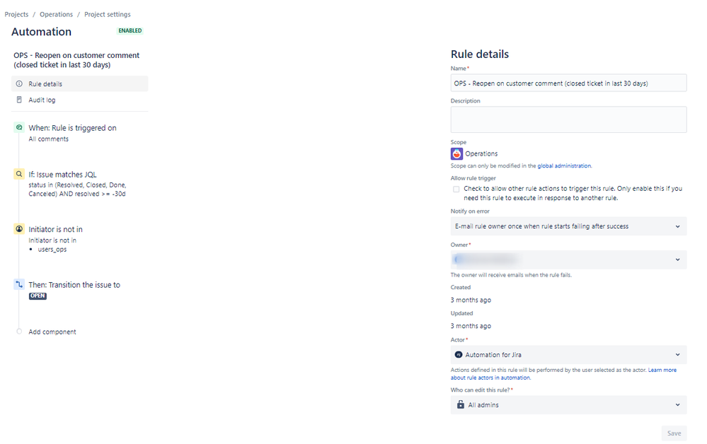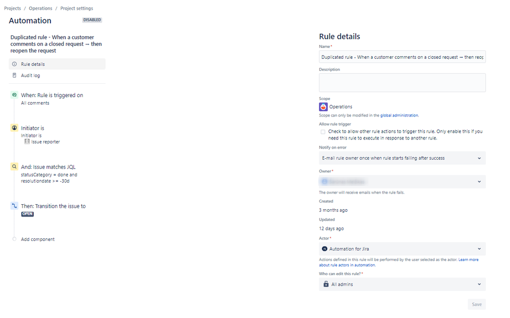 Note: If this is a Global/Multi-Project Rule, you'll need a Jira Admin to disable it. Project Admins can disable single-Project Rules.
