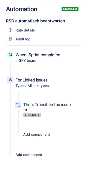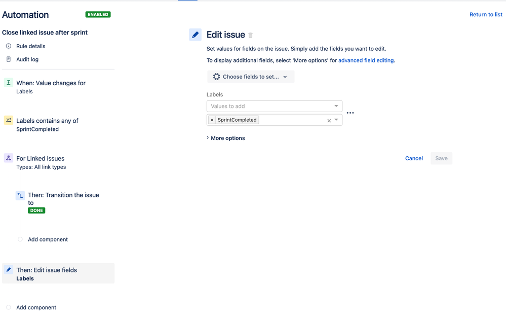 The first rule will add a temporary label to the issues in the sprint that was closed, in order to tag them.