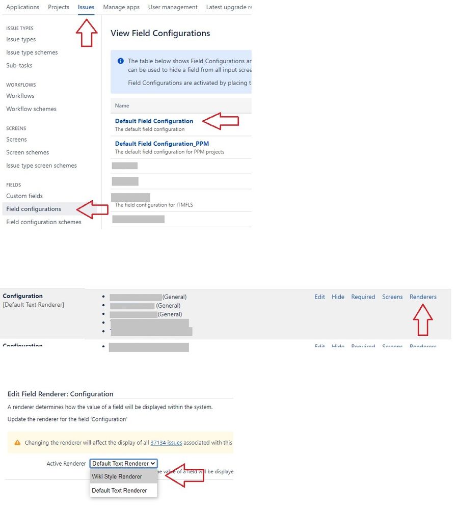 I created a new custom field and wanted to set up the render on the Wiki Style Render, but in the custom fields settings I don't see the render setting box, and there is no Wiki Renderer Macros Plugin. I have jira version 8.5.3