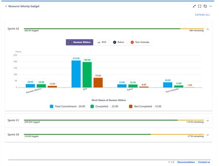 The app comes with couple of gadgets to track sprint status with multiple parameters and also to track team member's velocity in a sprint . Do try it out.