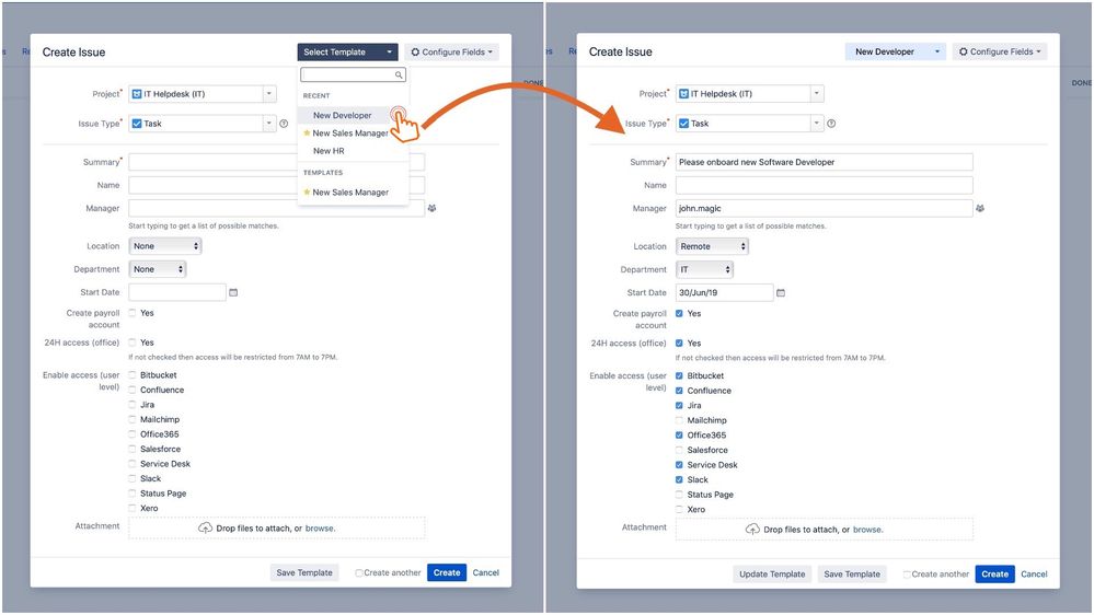 The plugin stores the input entered during the issue creation as a template which can be reused at any time to automatically populate the field values on the "Create Issue" form based on the selected template.