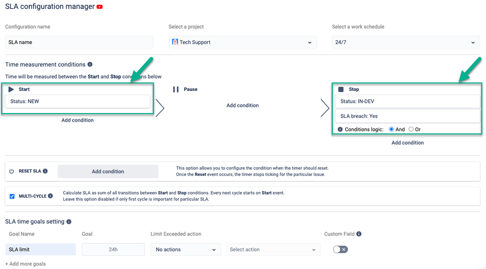 So we have created a custom field called as "SLA breach". This field should have "YES" value if the duration between "NEW" and "IN-DEV" is longer than 3 business days (but exclude weekends).