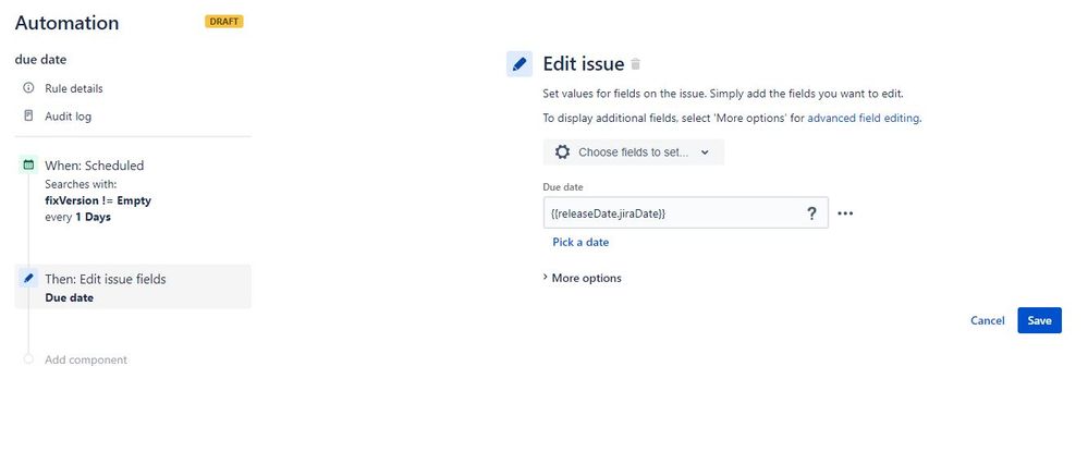 I am trying to set a scheduled rule to run every day that sets the due date of each issue that has a fix version. The due date should be the same as the release date set on that particular fixVersion.