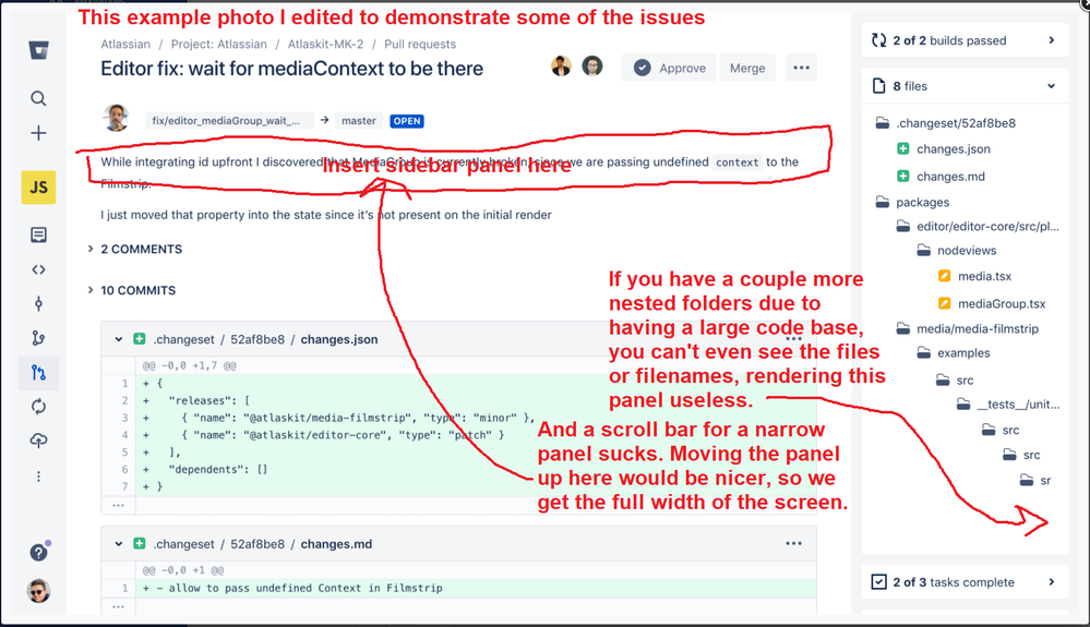 Or find someway to "Compress" the file paths so you can actually see the changed file. Having the list of files at the top (old view) is really nice. Maybe just put the old view file list into a div that has a max-height and make it scrollable if you really want more space for the code changes. Then you could remove the right panel.