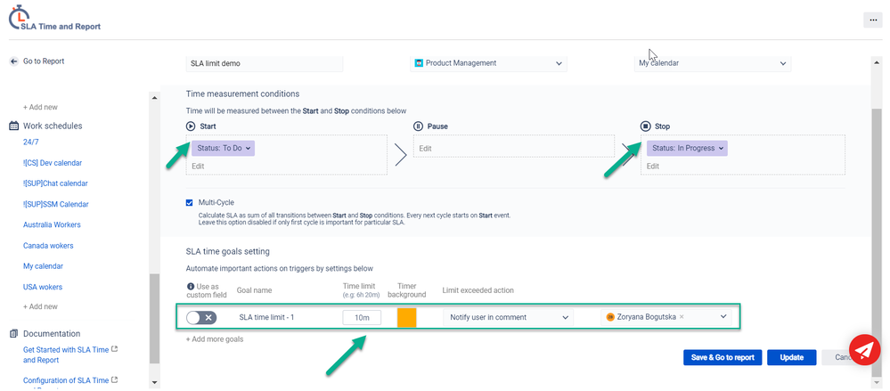 Using it, you can set conditions for the SLA timer according to your statuses and set escalation for overdue issues (notification, status, or priority changes)