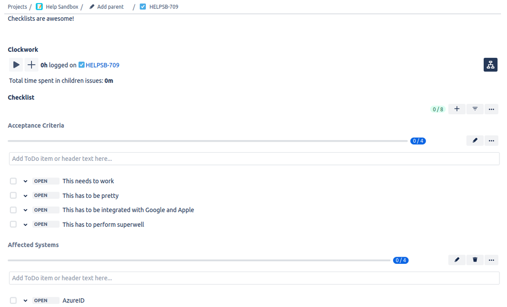If you're okay with using third-party add-ons, I think I've got just what you need. Acceptance Criteria and Affected systems could (should?) be checklists.