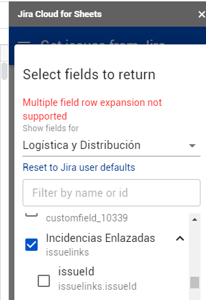 Testing on my local site and Google Sheets, I was able to select the Issue links fields and import the issues to Sheets, so I'm not sure if I followed the correct steps.