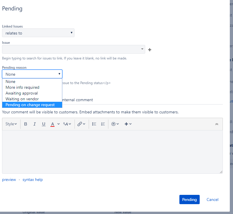 Too few options when a ticket is pending. I need to add more reasons such as: waiting on user etc