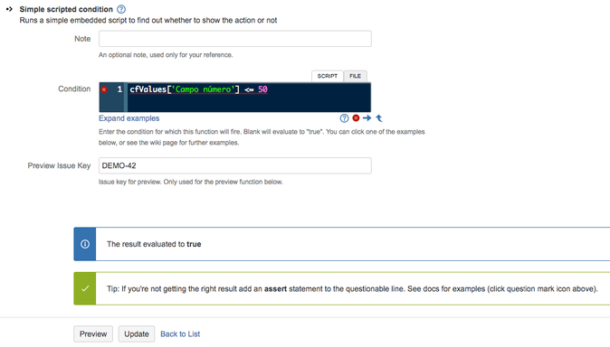 i got a state of an Issue which has two outgoing transitions (Transition A & Transition B). Regarding the value of a custom field (Type: number field) I want either Transition A or Transition B shown if the value is 50 or smaller. My try was using Scriptrunners Simple scripted condition: