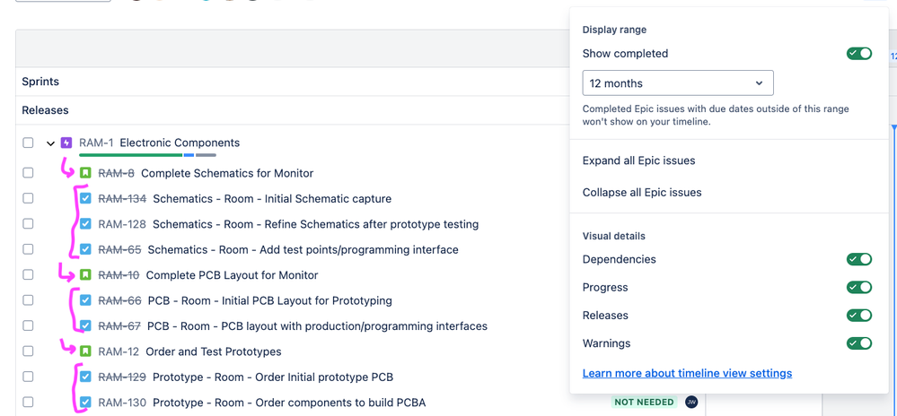 My team is using Jira Work Management as a project management tool and would like to see the tasks listed under their respective epics and subtasks under their respective tasks (in drop-downs) in the Timeline view.