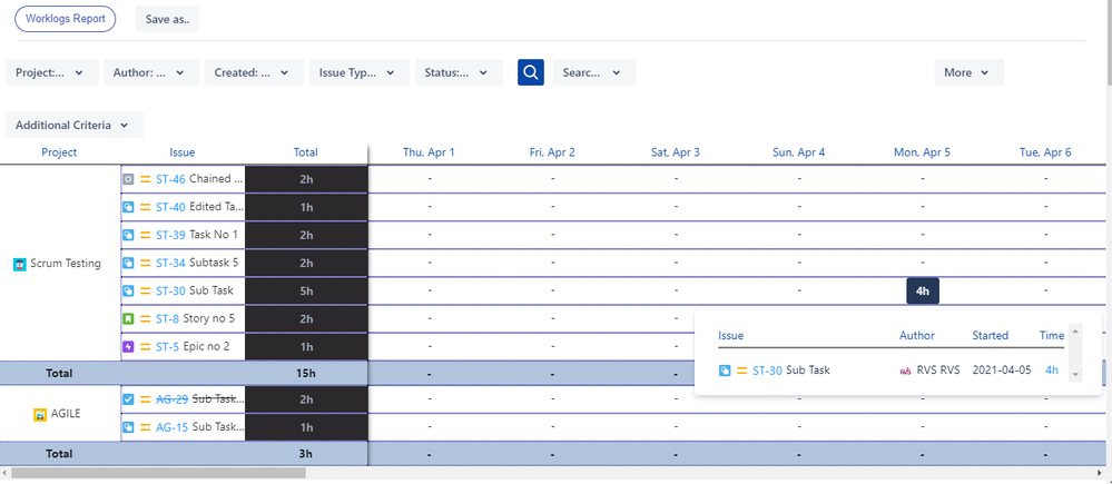 Worklogs & Time tracking Report :- Track time spent by resources with multiple filters / category / grouping features. Export to csv format is also available. You can filter based on worklogs time period as well.
