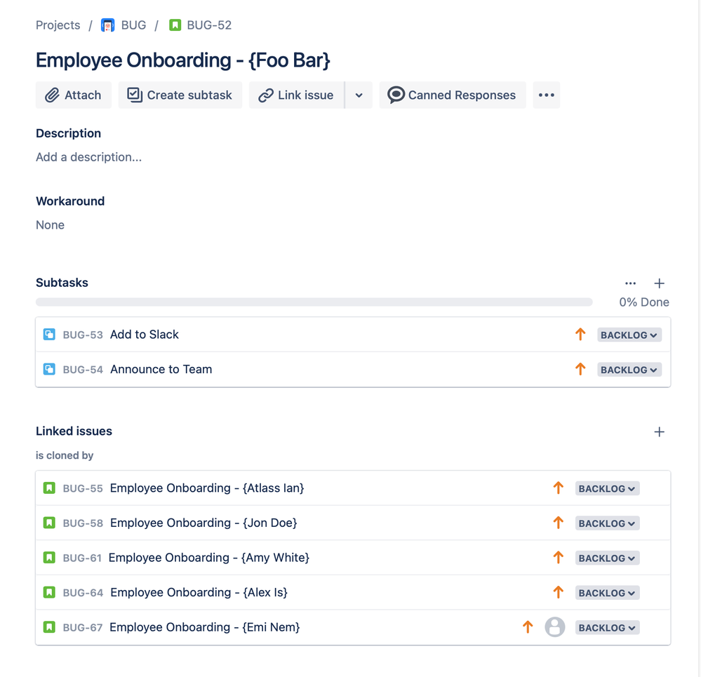 Under this parent story are 30 onboarding sub-tasks that are also cloned whenever we onboard a new person. Examples are: