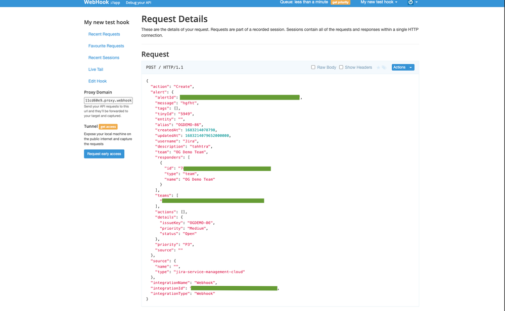 The webhook data includes the alert activity (create, acknowledge, etc.) as well as a subset of alert fields (such as the alert ID, username, alias, etc.) which can also include custom headers to add to the Webhook call.