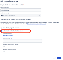 Once the integration is created for the outgoing rules to work you need to edit the settings and enable the "Authenticate with a Webhook account" option in the settings as shown in the screenshots below.