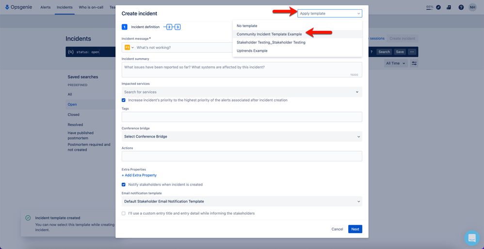 Then when manually creating an incident, select this incident template, and the extra properties will populate: