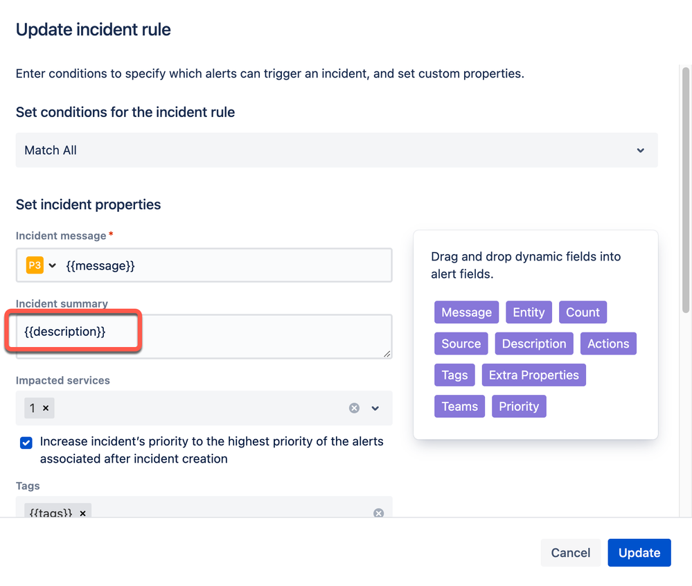 2. To add more details to the incident (which can be sent to Slack) you will need to add those details to the alert, which are then carried over to the incident via the incident rule.