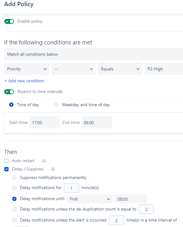 It feels simple to configure this using a routing rule. The question our team has is: What happens to P2 alerts that come in outside of business hours. Ideally these would get queued or batched and resubmitted at the start of the interval window, so that the on-call can begin to triage and review them. As far as we can tell from reviewing the docs and community questions, this is not possible. The only option is to route to "No One". Presumably the alerts are still created and open on the alerts tab, but it would be nice to get the notifications as a reminder.