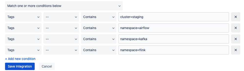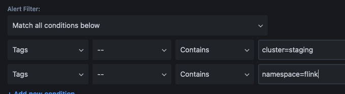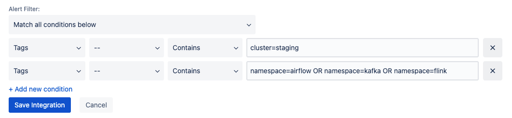 IF cluster=staging AND (namespace=airflow OR namespace=kafka OR namespace=flink)