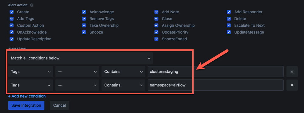 Alert Filter with Match one or more conditions below leads to receiving all alerts from staging cluster that not meet the initial requirement.